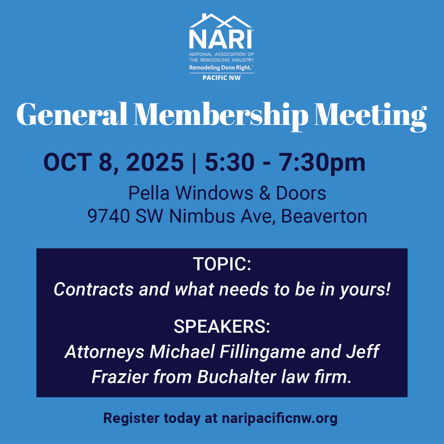 This happy hour will include a presentation by two local attorneys who specialize in construction and contracts. Michael Fillingame and Jeff Frazier from Buchalter will be sharing the important things you MUST have in your contracts and share some ways to keep you and your business successful. There will be a period for questions and answers so bring your legal questions to this one!